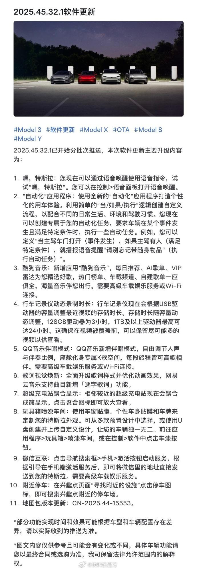 據了解,這次軟件更新版塊為2025.45.32.13,咫尺已開動面向掃數車型分批次推送,主要升級內容包括: